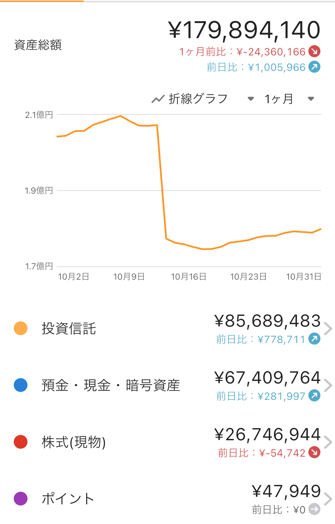 10月は、後述の通り、約573万円の黒字でした。なお、銀行口座からは、購入した区分マンションの残金3,025万円を支払ったので、冒頭のグラフで分かるように、トータルでも10/14にガクンと減り、口座残高は約6,180万円となりました。