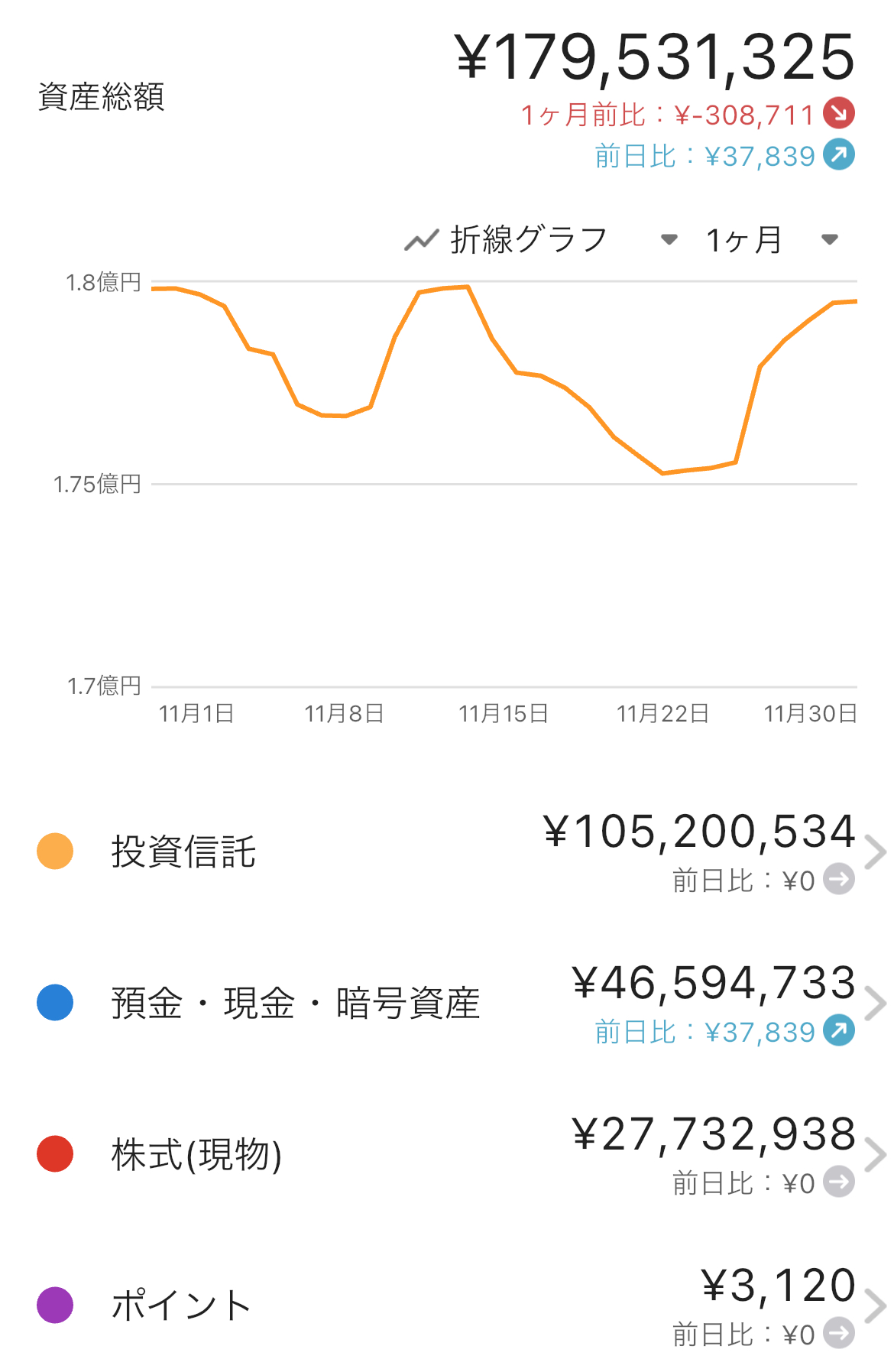これに加え、11月には、前々回のブログで書いていた通り、eMAXIS Slim 米国株式(S&P500)(11/8から楽天証券で運用)とeMAXIS Slim 国内株式(日経平均)(11/7からSBI証券で運用)に1,000万円ずつ一括投資しました。