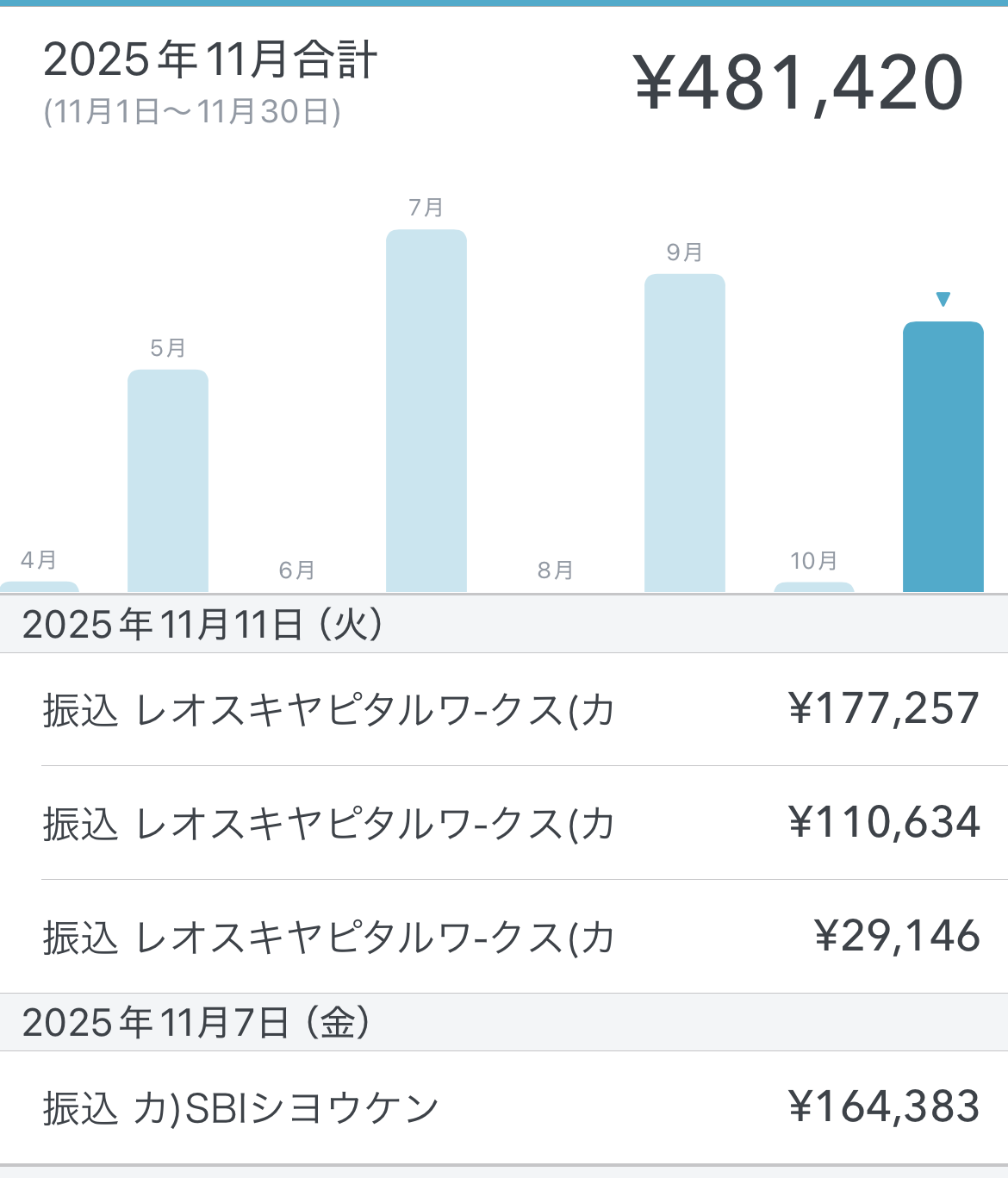 • 冒頭の画像はマネーフォワードの入金明細です。前回まで三井住友銀行の明細を添付していましたが、口座残高まで見えてしまうので、今後はマネーフォワードを利用します。