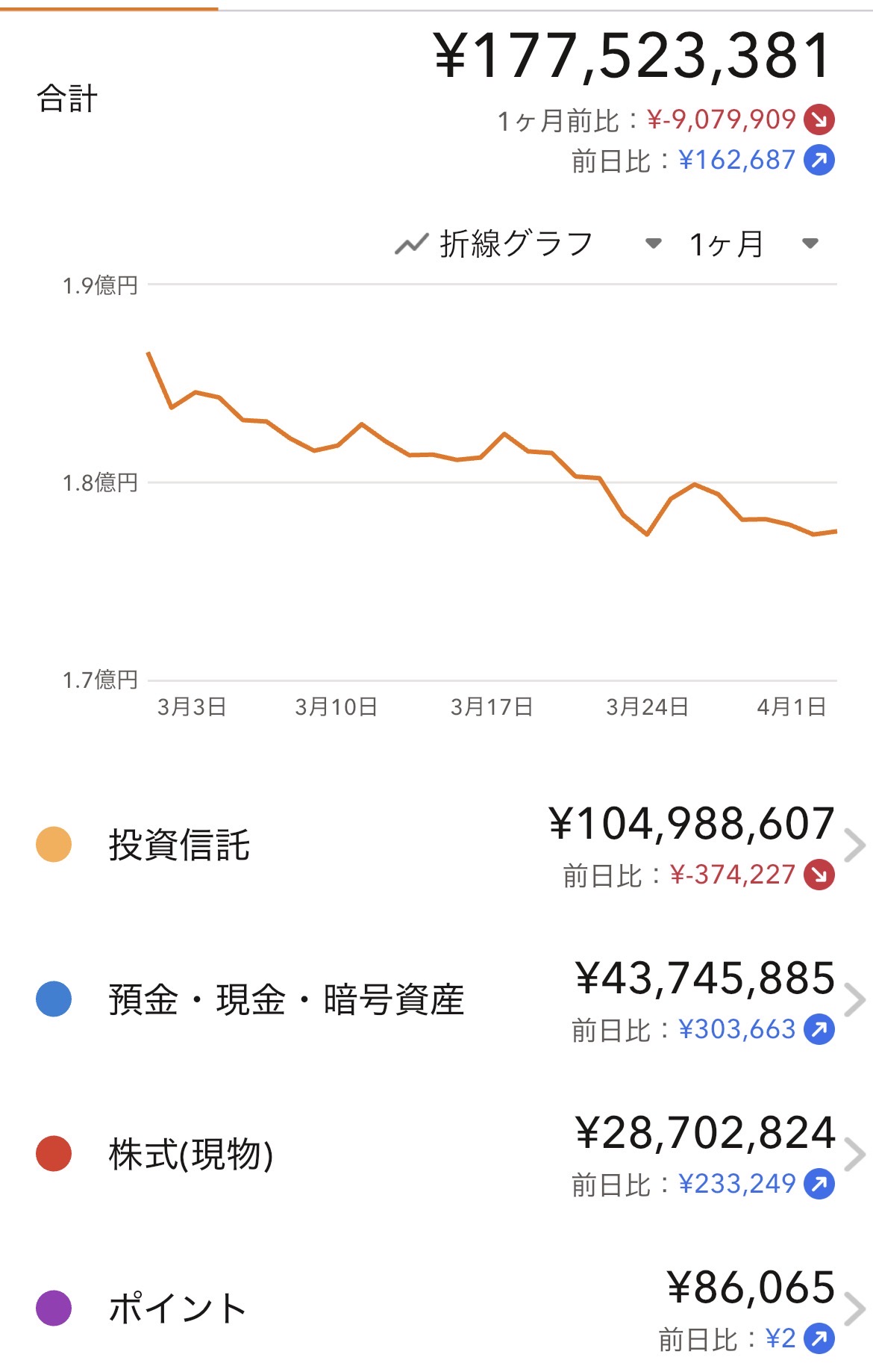 ※冒頭の折れ線グラフは、3/31のスクショを撮り忘れたため4/1のものになります。そして、何故かひふみ投信だけが3/27の終値から更新されないので合計額は不正確ですが、以下のひふみ投信はマネーフォワードではなく、ひふみ投信の公式サイトから拾いましたので正確な数字です。